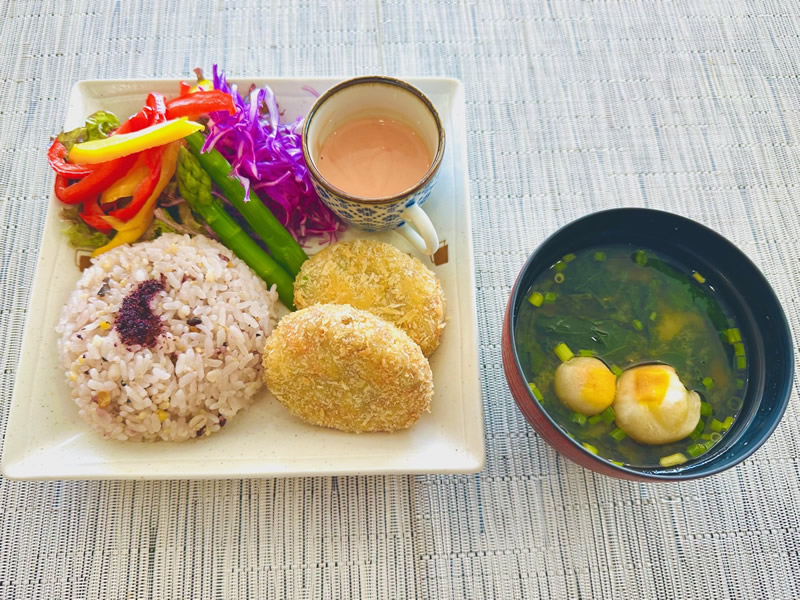 2025年8月11日 / 最終更新日 : 2025年8月11日 admin@ 7月の季節のメニュー 7月7日七夕🎋 3色ソーメン、油揚げのひき肉詰め焼きぶどう🍇ゼリー ある日のお昼ご飯🍙 ランチプレート十六穀米、赤・黄色ピーマンのマリネ、玉麸と小松菜の味噌汁 今月のサンドウィッチ🥪 エビ&ツナマヨサンド、クリームチーズサンド、シャインマスカット、オレンジジュース