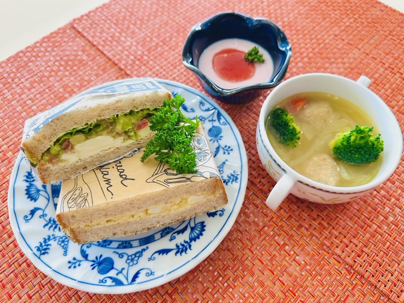 たまごサンドとクリームチーズのサンド、さつまいももブロッコリーのスープ、いちごババロア